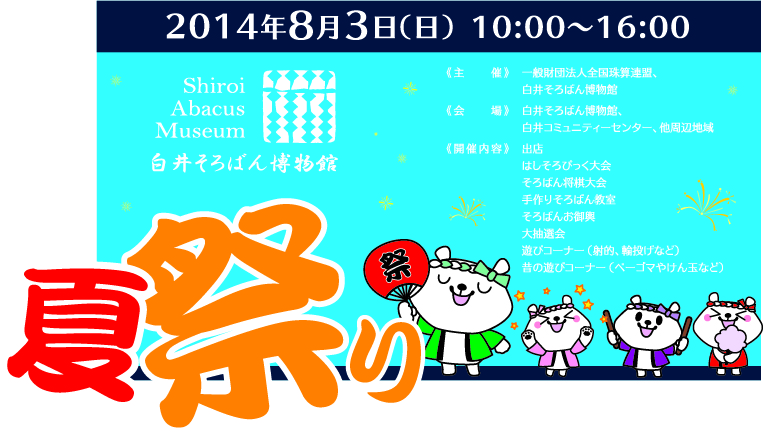 巨大流しそうめんや、やきそば、フランクフルト、かき氷、など出店がたくさん! かき氷の早食い競争などのイベント、ガラガラ抽選会。 射的・輪投げなどのお遊びコーナー。 白井名物の【そろばん神輿】もかつげます! 1.期 日 平 […]